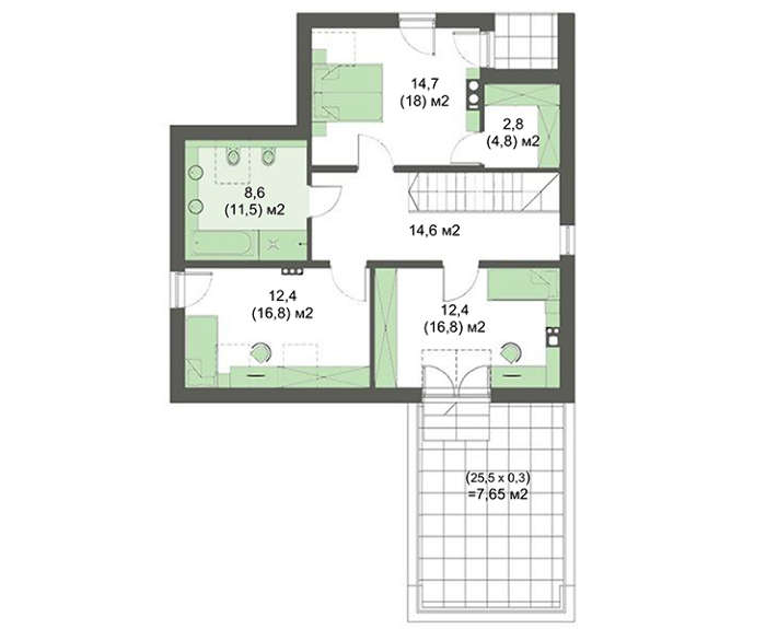 Все четыре спальных помещения подняты на второй уровень. Для повышения комфорта предусмотрены собственный гардероб и балкон.