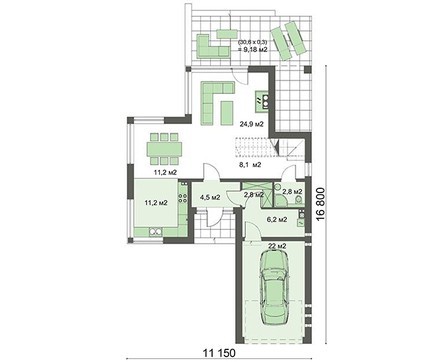 Полуоткрытая кухня не ограничивает работу хозяйки, ее площади достаточно для проведения семейных трапез. Размеры гаража рассчитаны на хранение одного автомобиля.