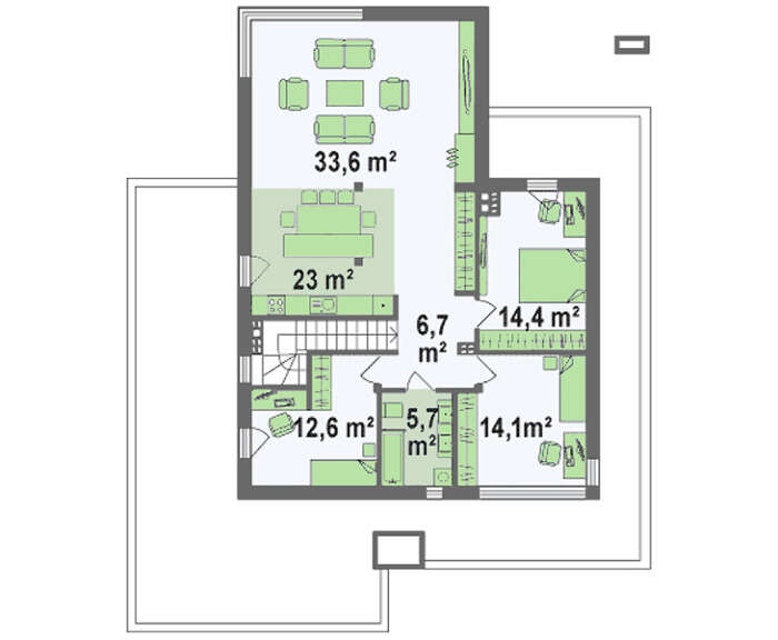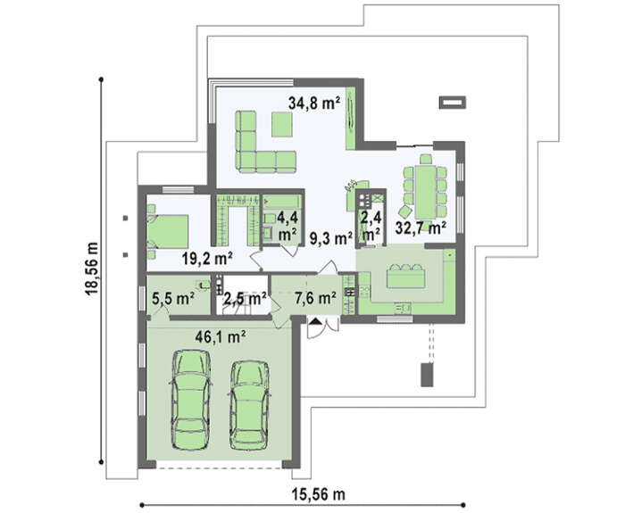 Дружная семья, ведущий публичный образ жизни и предпочитающая большие пространства, найдет отдушину на просторах современного двухэтажного коттеджа с плоской кровлей и гаражом на две машины. Серьезное внушающее уважение строение покорит самое требовательное сердце.