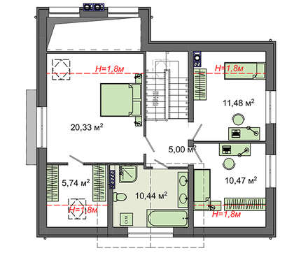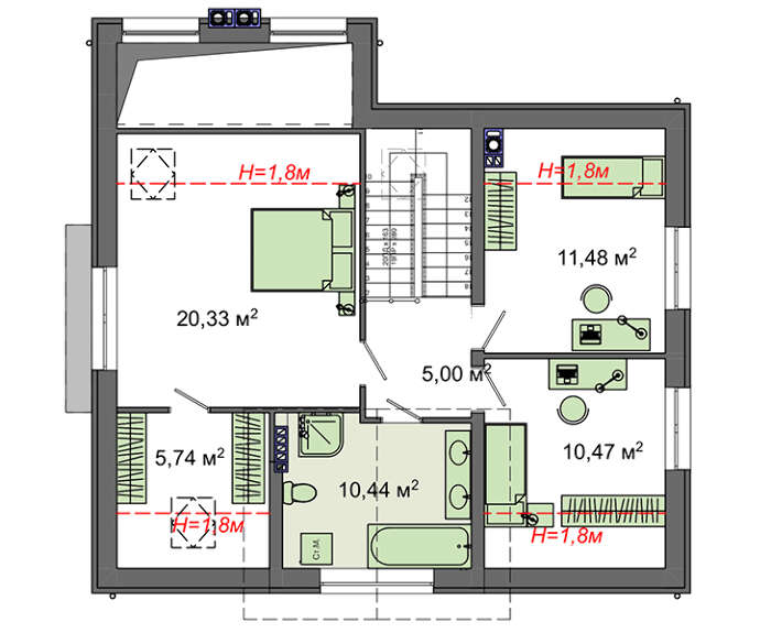 В то время когда первый этаж предназначен для дневного общего досуга, второй уровень рассчитан на ночной отдых. Здесь нет ничего лишнего. Две спальни не отличаются по площади, у жильцов не возникнут недоразумения в процессе выбора места проживания. Большая ванная комната позволит разместить самое современное оборудование. Просторные апартаменты хозяина более комфортные за счет собственного гардероба. Примечательно, что все спальни имеют выход на балкон.