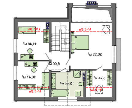 В то время когда первый этаж предназначен для дневного общего досуга, второй уровень рассчитан на ночной отдых. Здесь нет ничего лишнего. Две спальни не отличаются по площади, у жильцов не возникнут недоразумения в процессе выбора места проживания. Большая ванная комната позволит разместить самое современное оборудование. Просторные апартаменты хозяина более комфортные за счет собственного гардероба. Примечательно, что все спальни имеют выход на балкон.