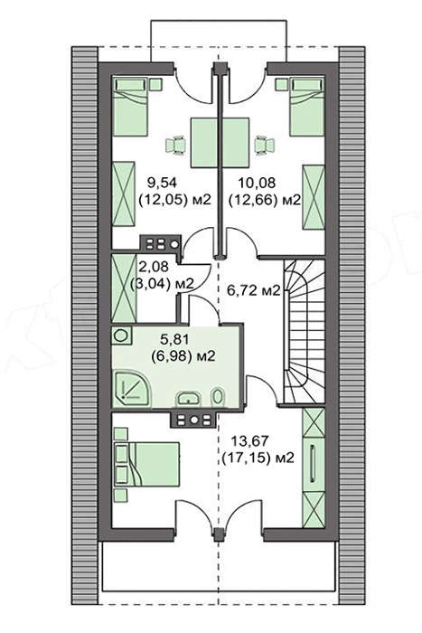 Стильный жилой дом, щедро декорированный деревом, прекрасно подойдет для небольшого узкого участка. Его планировка позволяет рационально вписать помещения в ограниченные формы, не нарушая степень благоустройства проживающих. Проектом предусмотрена просторная гостиная зона и три спальни с санитарными помещениями, для решения естественных потребностей. Размещенные в торце дома веранда и балкон, расширяют жилое пространство и позволяют большую часть времени проводить на свежем воздухе, тут же устраивать чаепития и вкусные обеды, встречать гостей, готовить шашлыки, заниматься спортом на небольших тренажерах.