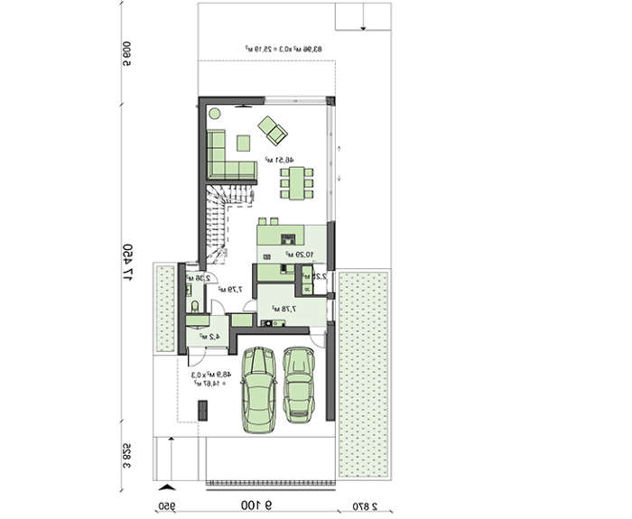 Еще одна особенность коттеджа заключается в его форме и уникальной планировке. Он идеально подойдет для узкого участка. Внутреннее пространство первого этажа отдано под гостиную. Здесь все продуманно для приема друзей и родственников обитателей дома.