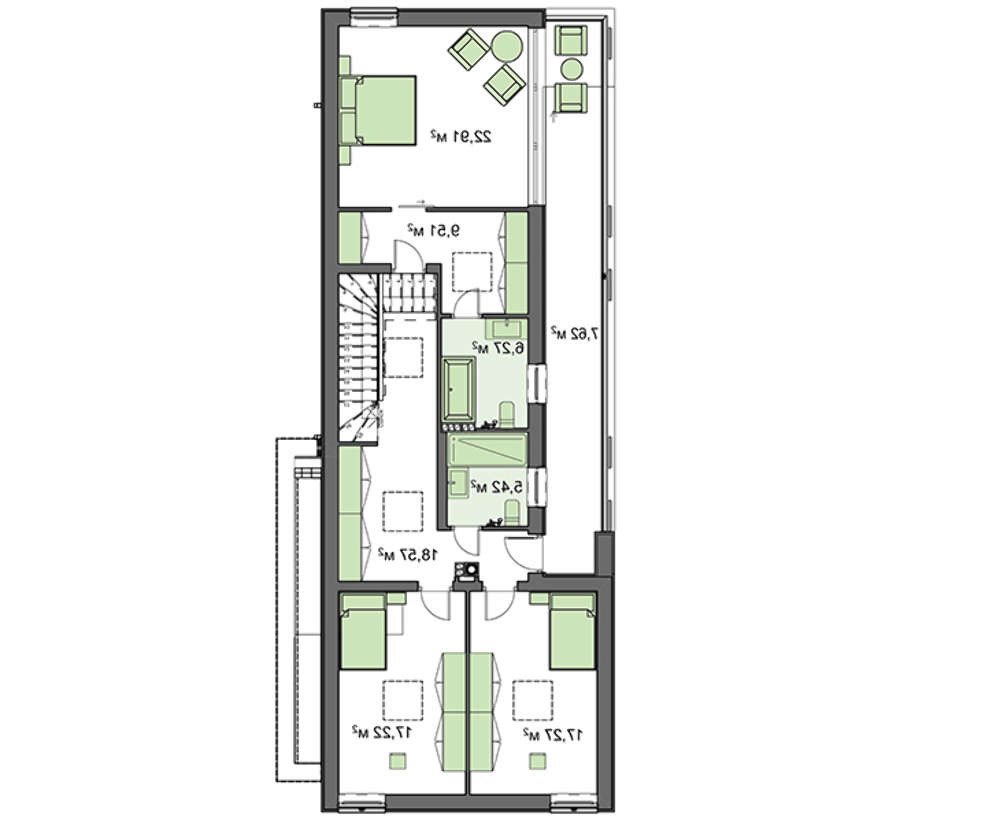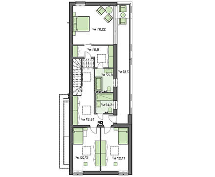 Второй этаж отдан под личную территорию членов семьи. Основную площадь занимают апартаменты хозяина повышенной комфортности. Здесь еще находятся две спальни одинаковой площади совмещенный санузел и просторный балкон.