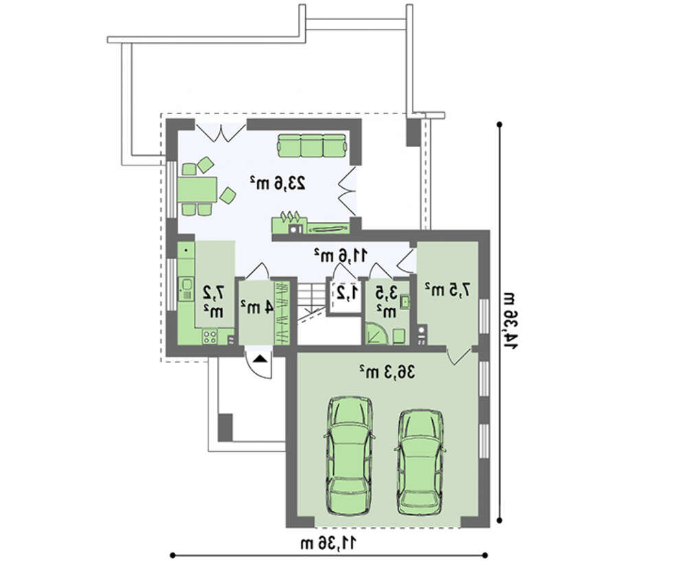 Первый этаж помещает довольно просторный гараж, расположить два приличных автомобиля представительского класса — его цель. Здесь легко выполняются все работы, связанные с обслуживанием авто и хранением требуемого инструмента. Гостиная имеет сложную форму, разделена на две зоны: для приготовления пищи, для приема гостей и организации пиршеств. Такая планировка позволяет хозяйке независимо и не потревожено куховарить, при этом все кухонные запахи останутся внутри комнаты. Гостиная часть за счет собственного выхода на загородный простор дает возможность дружескую встречу проводить в окружении цветов и лужаек, а приготовленные на свежем воздухе шашлыки оставят у друзей незабываемые впечатления.