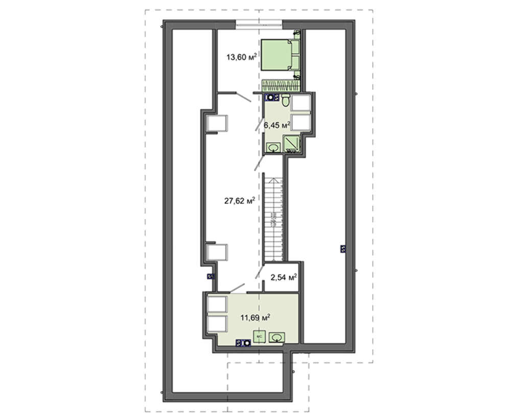 Особенность красивого коттеджа в его втором этаже. Небольшая площадь позволяет организовать только одни спальные апартаменты, в пространство, которых включен личный санитарный узел, прачечная, комната для приема водных процедур и дополнительные гардеробные помещения.