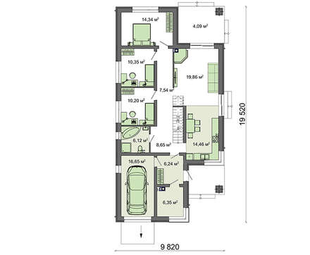 Существует мнение, что небольшой загородный участок ограничивает фантазию архитектора и загоняет ее в жесткие габариты. Эту теорию отрицает стильный одноэтажный жилой дом для узкого участка, на площадях которого найдено место для всех требуемых для комфортного проживания помещений: гостиной, четырех спален, санузлов, гардероба и гаража для хранения одного вида транспорта.