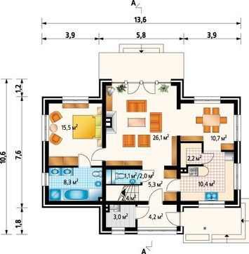 Проект содержит три раздела – Архитектурный, Конструктивный и Инженерный: водоснабжение, отопление, вентиляция, канализация, электроснабжение (приобретается за дополнительную плату) + Пояснительная записка.