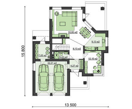 Своей нависающей крышей коттедж напоминает жилые дома альпийских гор. За счет такой архитектурной особенности в жаркое время прямые потоки солнца обходят стороною территорию комнат. А в зимнее время снежные сугробы не подбираются близко к поверхности стен. Встроенный гараж позволяет, не покидая жилой дом, обслуживать автомобиль.