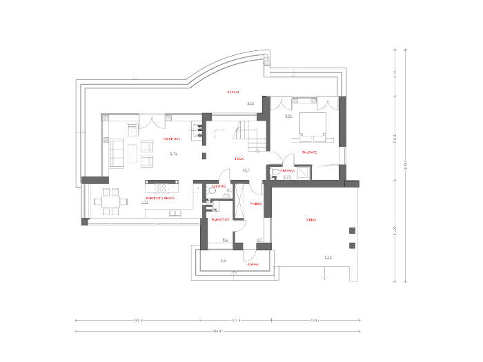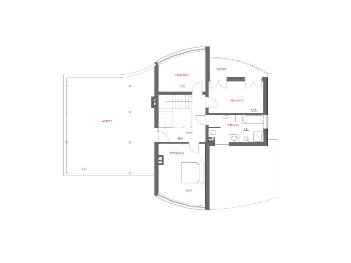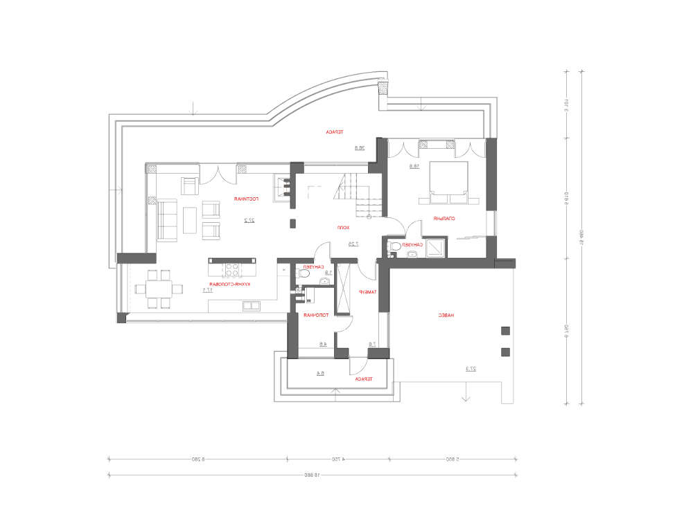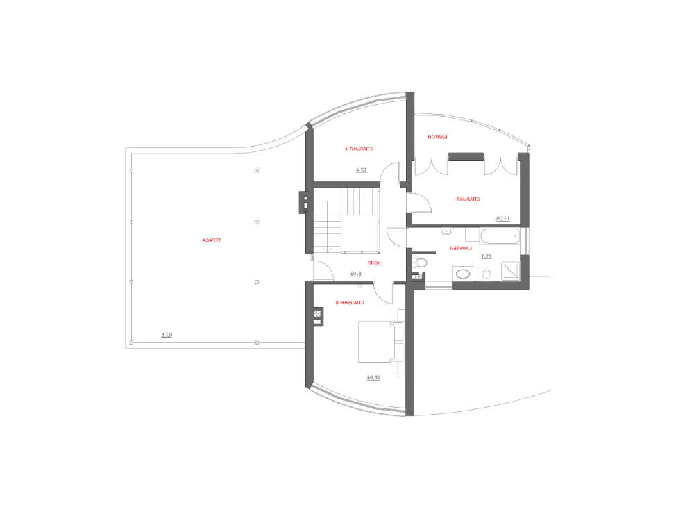 Хозяйственные помещения, такие, как топочная, находятся тоже на первом этаже. Через тамбур можно попасть на одну из двух террас первого этажа. С хозяйской спальни можно выйти на вторую просторную террасу – за счет такой планировки энергия Воздуха беспрепятственно проникает в спальню и энергетически питает дом.