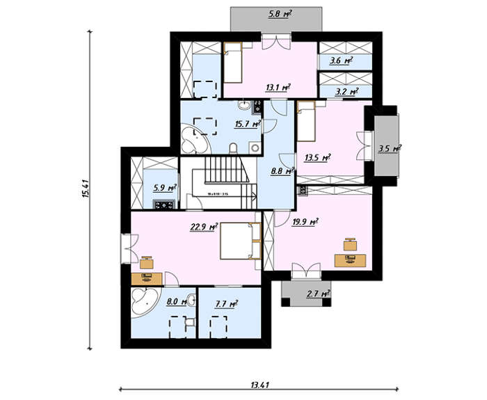 Второй уровень предназначен для личной территории членов семьи. Имеются апартаменты хозяина дома с личным санузлом, гардеробом и рабочим кабинетом. Гордость дома — большое помещение с балконом, его можно использовать по интересам, устроив студию, биллиардную или тренажерный зал. Остальной этаж занимают две спальни с гардеробами и балконами, общий санузел с бытовой комнатой.