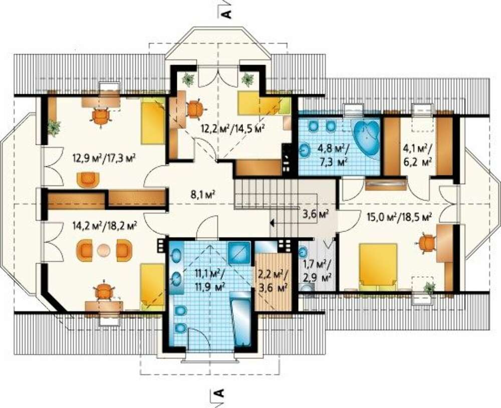 Четыре просторные личные комнаты второго этажа рассчитаны на размещения членов большой семьи. Особенно удобными и интересными их делают балконы, выходы на которые предусмотрены со всех спален. Для принятия водных процедур имеются специальные апартаменты на две комнаты. Такой простор позволяет разместить самую современную технику и оборудование. Наибольший комфорт дан личным апартаментам хозяина. Две комнаты, индивидуальный балкон, свои санитарные удобства делают помещение практически независимым.