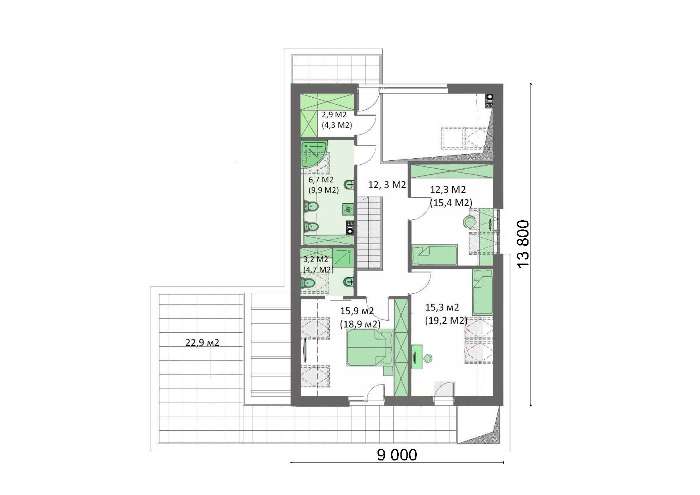 Второй этаж включает три спальни. Хозяйские хоромы выделяются большей площадью и собственным санузлом.