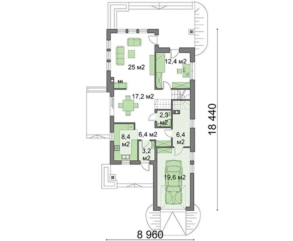 Пространство первого этажа можно смело поделить на отдельные помещения. Центральное место занимает гостиная. В ней находится камин. Именно он служит центром объединения всей дружной семьи. Зона отдыха обустроена удобной мягкой мебелью и домашним кинотеатром. Помещение имеет выход на небольшую открытую веранду.
