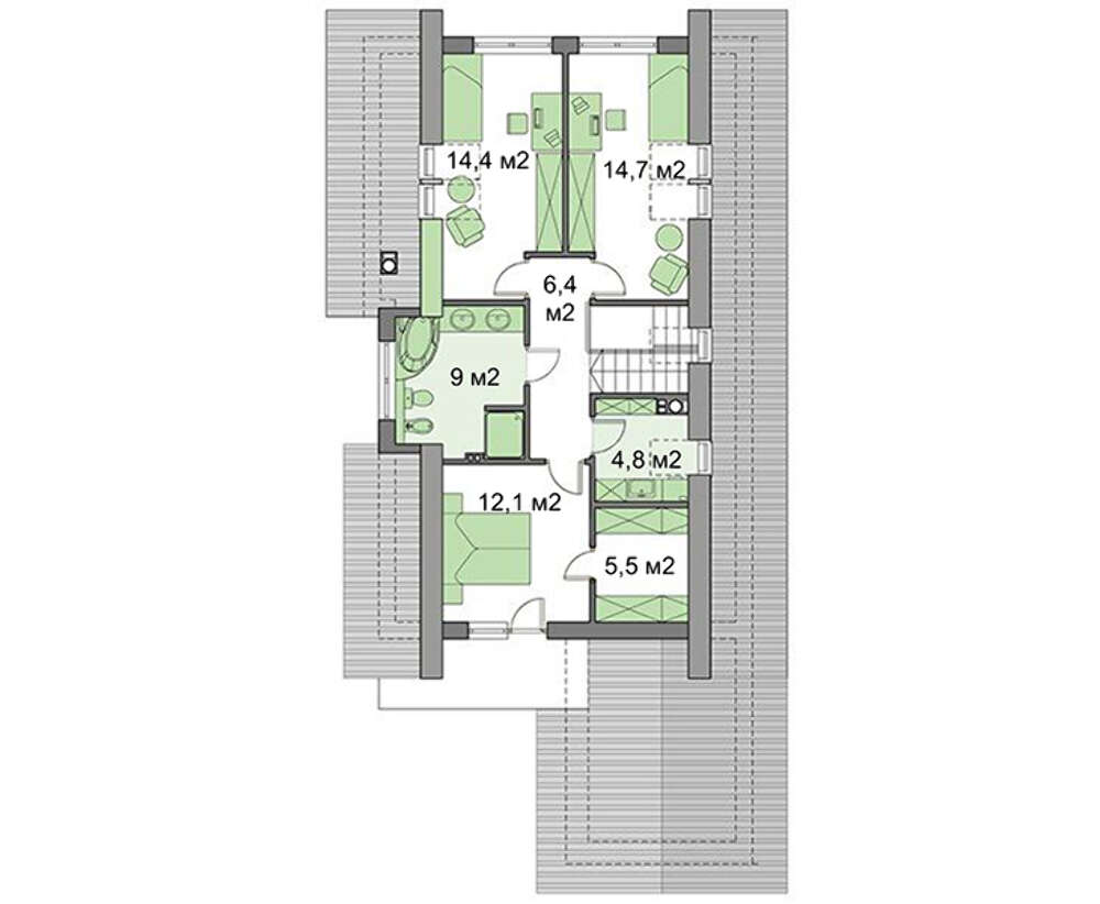 Второй уровень предназначен для личного пространства членов семьи. Он включает хозяйские апартаменты повышенной комфортности с личным балконом и гардеробом, две детские спальни, санитарное помещение и общую комнату для одежды.