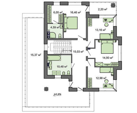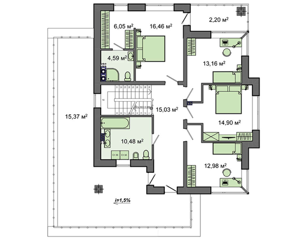 Второй уровень полностью отдан под территорию сна и релаксации. Здесь расположены три спальни, санитарная комната с ванной, стиральной машиной. Гордостью особняка считается большая открытая веранда, в летнее время на ней планируется отдыхать и принимать солнечные ванны.