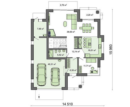Пространство первого этажа выполнено максимально функционально. Дверь открывается в большую прихожую со шкафами для одежды и зеркалами в полный рост. Слева расположен просторный гараж, который не только вмещает два автомобиля представительского класса. Имеется дополнительное место для хранения квадроцикла или организации эллинга под небольшую яхту. Подсобное помещение топочной желательно использовать, как мастерскую, без нее в частном доме обойтись трудно.