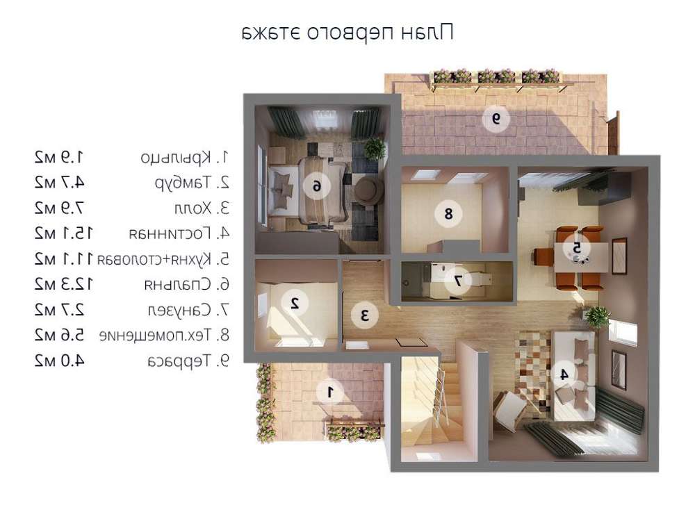 Внутреннее пространство дома разделено на две зоны: дневную и ночную. Под первую отдан практически весь нижний этаж. Основную площадь занимает зал, объединивший гостиную, столовую и кухню. Отсутствие перегородок обеспечивает ощущение простора. Здесь хозяева отдыхают, едят, принимают гостей. Соседство с террасой позволяет в теплое время устраивать вечеринки и пикники прямо на свежем воздухе. Спальня в 12 кв. м. часто используется для членов семьи старшего поколения. Остальная площадь уровня распределена между прихожей, котельной и санузлом.