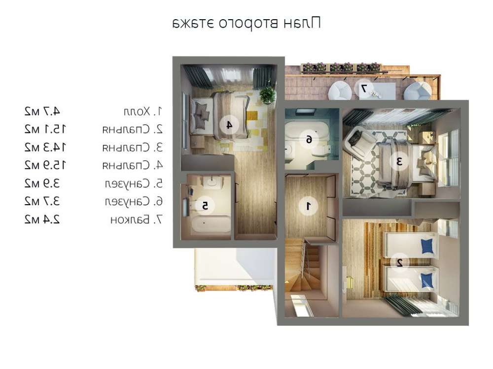 Второй этаж занимают апартаменты хозяина дома с личной ванной комнатой и выходом на балкон и две спальни.