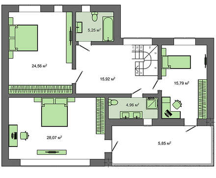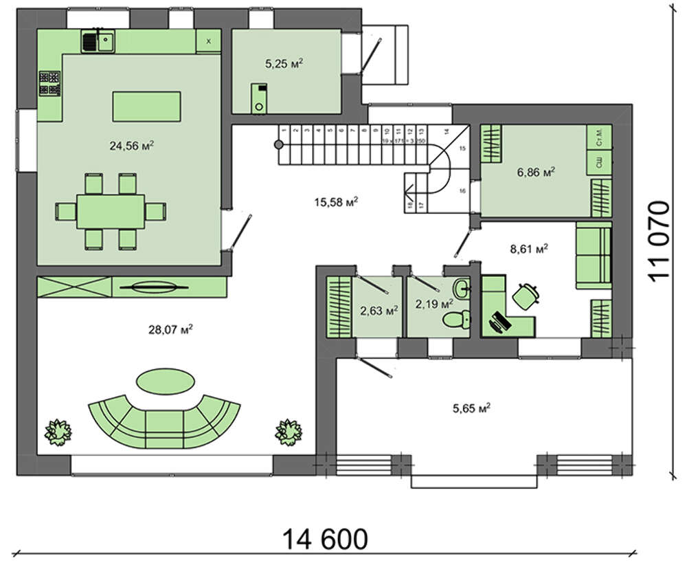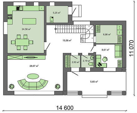 Центральное место дневной зоны занимает гостиный зал площадью почти 25 квадратов. Он рассчитан на общее времяпрепровождение всей семьи, встречи с друзьями и деловые переговоры. Кухня-студия не оставит хозяйку равнодушной. Просторная комната в 21 кв. м. позволяет разместить новейшую бытовую технику и большой обеденный стол. Планировка упрощает хлопоты по сервировке ужина или семейного торжества.
