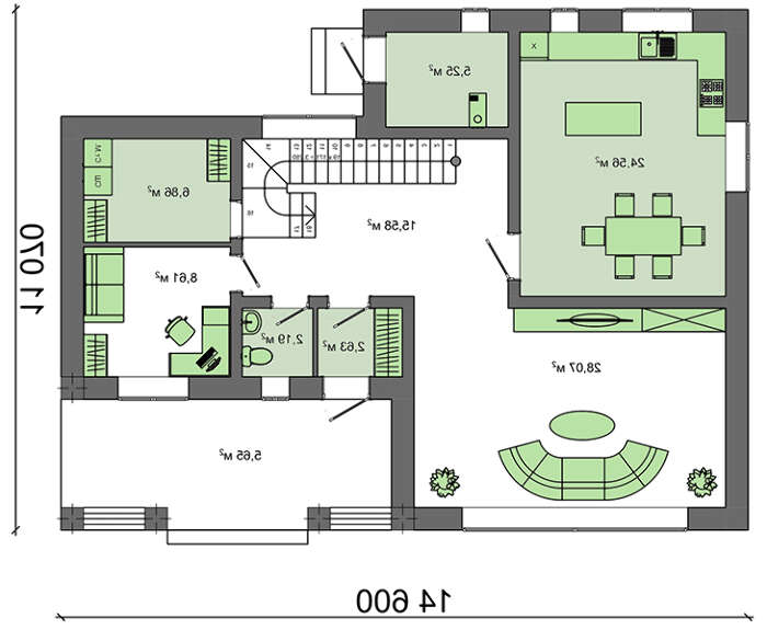 Центральное место дневной зоны занимает гостиный зал площадью почти 25 квадратов. Он рассчитан на общее времяпрепровождение всей семьи, встречи с друзьями и деловые переговоры. Кухня-студия не оставит хозяйку равнодушной. Просторная комната в 21 кв. м. позволяет разместить новейшую бытовую технику и большой обеденный стол. Планировка упрощает хлопоты по сервировке ужина или семейного торжества.
