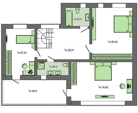 Внутренняя планировка дома поддерживает минимализм. Основные комнаты просторные, на подсобные и технические выделено по несколько квадратов. Пространство поэтажно разделено на две зоны: ночную и дневную. Территория сна находится на втором уровне. Она включает апартаменты хозяина 24 кв. м. с собственной ванной комнатой, детскую, спальню для гостей 21 кв. м., небольшой холл и санузел.