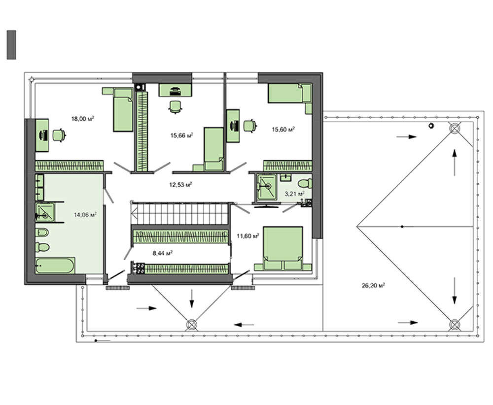 Второй этаж — царство для отдыха. Четыре спальных комнаты легко поместят всех членов многочисленного семейства. Обширная терраса, выход на которую имеется из двух помещений, поможет членам семьи большую часть времени проводить на свежем воздухе, радоваться красоте природы, наблюдать за восходами и закатами.
