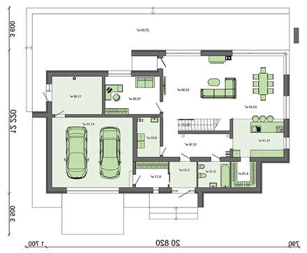 На первом этаже предусмотрено строительство встроенного гаража, площадь свободно поместит два автомобиля.
