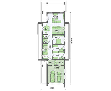 Дом для узкого участка включает в свои просторы три спальных помещения. Для приема родственников и приятелей общее пространство соединено в одну зону, которая включает гостиную, столовую и кухню.