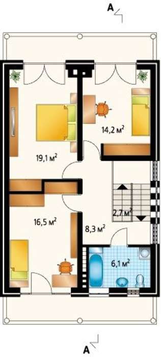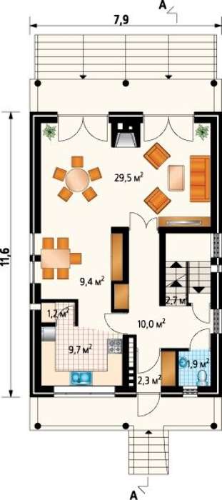 Внутреннее пространство строения включает три этажа, один из которых цокольный. Если нет необходимости в его использовании под склад или для хранения съестных запасов, пространство может быть тренажерным залом или сауной, курительным помещением или винным погребом. Перед хозяевами открывается много возможностей.