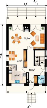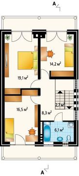 Для приема друзей и родственников в этом жилом доме выделен второй этаж. Гостиная объединяет все помещения. Удаленная часть отдана под кухню. Размещение рядом со столовой упрощает труд хозяйки. В оставшемся пространстве достаточно места для проведения пышных празднеств и шумных вечеринок. Особенным помещение делают балконы. Они просторные и большие по размерам, предусмотрены выходы из всех жилых зон.