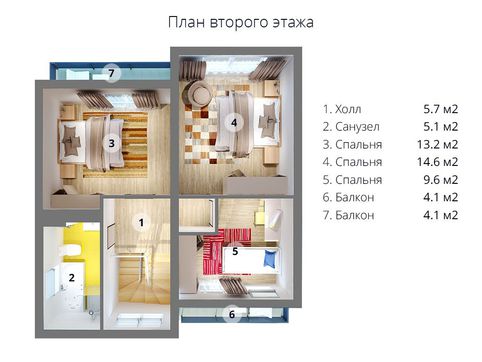 Второй этаж выделен под личное пространство жильцов дома. Это три спальни различной площади, две из которых имеют собственные балконы, что позволяет выпить на свежем воздухе чашечку утреннего кофе или полюбоваться красивым закатом. Для удобства на этаже предусмотрен санузел.