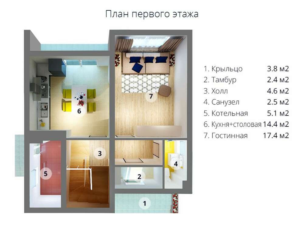 Внутренняя планировка выполнена с присущей рачительным людям практичностью. На первом этаже расположены комнаты для дневного времяпрепровождения. Это просторная гостиная, предназначенная для встреч с друзьями, партнерами и для семейного отдыха. В смежной комнате находится кухня-столовая. Ее используют для повседневных трапез и праздничных застолий.
