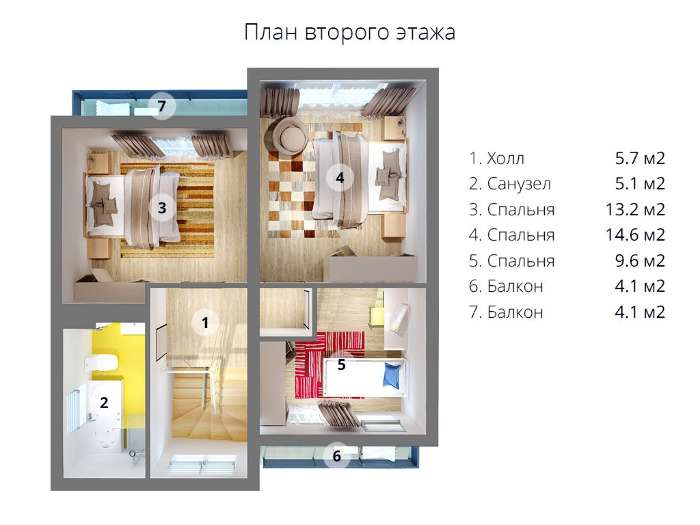Второй этаж выделен под личное пространство жильцов дома. Это три спальни различной площади, две из которых имеют собственные балконы, что позволяет выпить на свежем воздухе чашечку утреннего кофе или полюбоваться красивым закатом. Для удобства на этаже предусмотрен санузел.