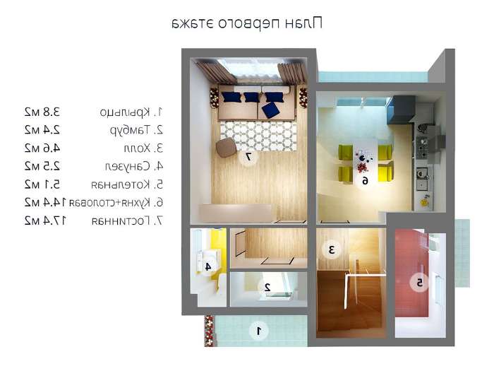 Внутренняя планировка выполнена с присущей рачительным людям практичностью. На первом этаже расположены комнаты для дневного времяпрепровождения. Это просторная гостиная, предназначенная для встреч с друзьями, партнерами и для семейного отдыха. В смежной комнате находится кухня-столовая. Ее используют для повседневных трапез и праздничных застолий.