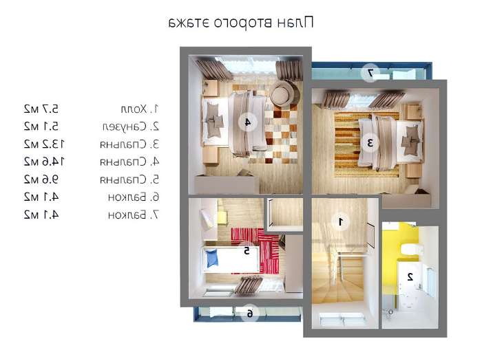 Второй этаж выделен под личное пространство жильцов дома. Это три спальни различной площади, две из которых имеют собственные балконы, что позволяет выпить на свежем воздухе чашечку утреннего кофе или полюбоваться красивым закатом. Для удобства на этаже предусмотрен санузел.