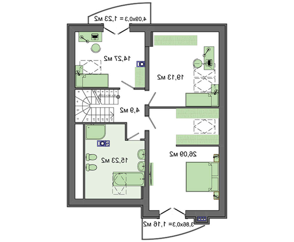 В этом проекте загородного дома есть камин в гостевой, сан узлы конечно Вы можете разделить, так как в любое типовое решение можно вносить изменения. Для детального ознакомления отправим Вам на электронный адрес линейные размеры этого проекта. Будут вопросы пишите и звоните, будем рады общению!