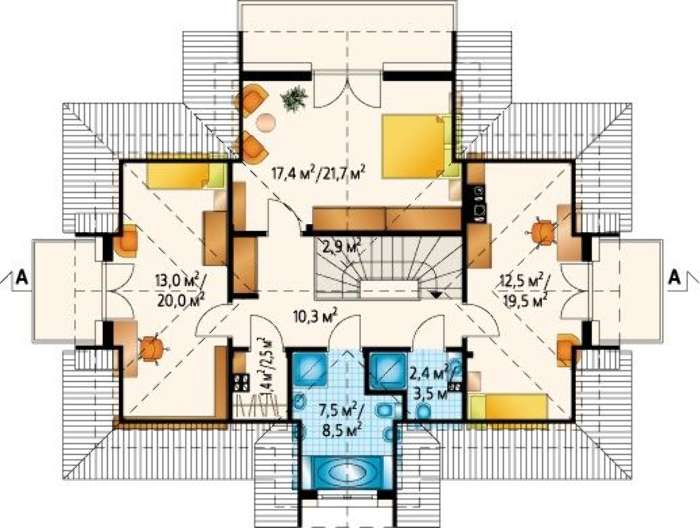 Одна из спален признана особенной, ей выделено отдельное место на первом этаже, что удобно для старшего поколения не имеющего желания покорять высоты.