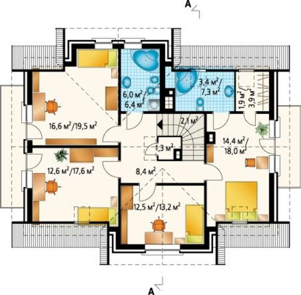 Для проживания членов семьи выделено четыре личных помещения второго этажа. Достаточная площадь рассчитана на требуемое количество мебели. Объединение двух спален через балкон позволяет жильцам часть времени проводить совместно на свежем воздухе. В особом почете спальня хозяина. Ее преимущества в балконе, гардеробном помещении и собственном санитарном узле.
