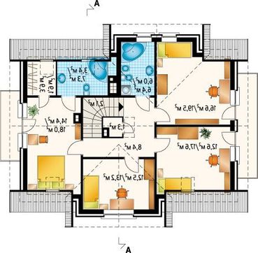 Для проживания членов семьи выделено четыре личных помещения второго этажа. Достаточная площадь рассчитана на требуемое количество мебели. Объединение двух спален через балкон позволяет жильцам часть времени проводить совместно на свежем воздухе. В особом почете спальня хозяина. Ее преимущества в балконе, гардеробном помещении и собственном санитарном узле.