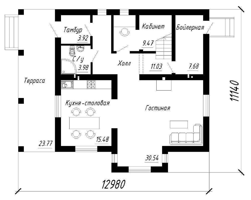 Проект содержит три раздела – Архитектурный, Конструктивный и Инженерный: водоснабжение, отопление, вентиляция, канализация, электроснабжение (приобретается за дополнительную плату) + Пояснительная записка.